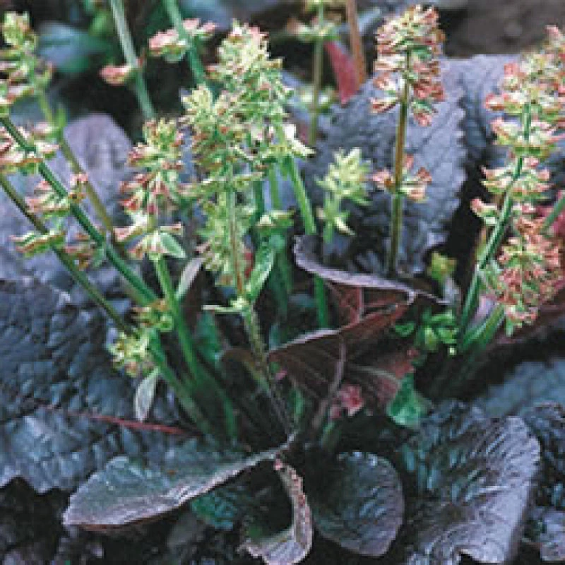 - Glossy burgundy rosettes add unique spring color.